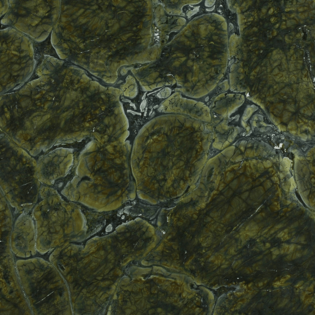 Quartzito com veios marcantes em tons de verde (do mais claro ao mais profundo), que ressaltam seu caráter exótico; acabamento “deep” recomendado para enfatizar a textura natural em áreas molhadas.